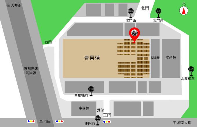 正門、または北門からお入りください。そこで一旦車を止めて入場証を入手します。警備員に「大治(または青果)に商談に行きます。時間はXX分くらいです。」と伝えると入場証がもらえます。
